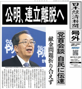「下駄の雪」と称されてきた公明党がついに自公連立政権から離脱することを通告した。表向きは、公明党がとりわけ重要視したのが「政治とカネ」問題の取り扱いであり、自民党が最も飲めない「政治とカネ」の企業団体献金の問題を突き付けたことにあるとしている。しかし、政治評論家の後藤謙次氏は「これまでの『自公連立』は繰り返し、例えば大きく政権が交代する時には、事前の人事の前の段階で、『創価学会』とそれから公明党と幹部に『こういう人事やります』という意味で、仁義も切っていたわけですね。今回は全く通告なしにむしろ総裁就任直後から高市さんが公然とと言いますか、国民民主党の玉木雄一郎代表に会ったり、麻生さんが榛葉幹事長と、これもテレビカメラが見えるようなところで会ったりということで、ある面で公明党に喧嘩を売っている」(TBS:2025.10.10)と述べた。