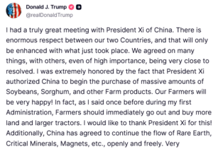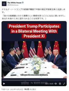 10/30、トランプ米大統領のアジア歴訪の締めくくりであった、韓国(釜山)・APEC会合での、米中首脳会談について、トランプ氏は、中国の習近平国家主席との会談は「本当に素晴らしいものだった」、「両国間には計り知れないほどの敬意があり、今回の会談によってそれがさらに深まるだろう。」、「0から10のスケールで、10が最高だとすれば、今回の会談は12点だったと言えるでしょう」と自らを礼賛した(TruthSocialへの投稿)。