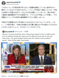 10/30、『アトランティック』誌や『ファスト・カンパニー』誌への寄稿で知られるジャーナリストのスロウィエツキ氏はXへの投稿で、「これはトランプが自ら作り出した問題を、解決どころか、ただごまかしているだけだ。トランプが最初に大統領に就任した当時、中国は米国から年間3000万トン以上の大豆を購入していた。トランプによる最初の対中貿易戦争でその量は激減し、ブラジルが市場シェアを奪った。そして、トランプの2度目の貿易戦争で状況はさらに悪化した。中国の大豆需要は2017年当時よりもはるかに大きい。しかし、今回の合意後でさえ、中国による米国産大豆の購入量は2017年当時よりもはるかに少ないだろう。これはすべてトランプのせいだ」、「トランプ氏は、最新の政策ミスによって、自らが引き起こした問題さえも解決できていない。トランプ大統領は問題を作り出しただけで、真の解決策は何も提示していない」と手厳しい。