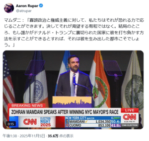 11/4・投開票のニューヨーク市長選で、トランプ大統領から「ニューヨークを破壊しようとしている」「共産主義者の狂人」などと激しく攻撃を受けていた民主党左派のゾーラン・マムダニ(Zohran Mamdani)氏が勝利を獲得した。