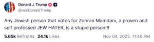 そしてトランプ氏は、投票日当日、投票開始からわずか数時間後に自らのTruthSocialに「ゾーラン・マムダニ、この明白な、そして自称するユダヤ人嫌いに投票するユダヤ人は、愚か者だ!」と、ユダヤ系住民の40%以上がゾーランに投票していることに怒りをぶちまける投稿までしている。