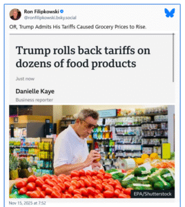 トランプ氏は、この大統領発令の直前、11/12、11/13両日に至っても、「食料品は大幅に下落している」と強弁していたのである。「あらゆるものが大幅に下落している」、「トランプ政権下で物価は下落しており、しかも大幅に下落している」、「誰もがトランプ政権下では物価がバイデン政権下よりもはるかに安くなっていることを知っている。そして、物価は大幅に下落している」と大うそとでたらめをばらまいていたのである。11/9には、「関税に反対する奴らは愚か者だ! 我々は今や世界で最も裕福で、最も尊敬される国であり、インフレ率はほぼゼロ、株価は史上最高値を記録している。」とまでうそぶいていたのである。