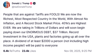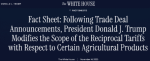 11/14、トランプ政権は、「牛肉、ココアとスパイス、コーヒーと紅茶、バナナ、オレンジ、トマト、その他の熱帯果物と果汁、そして肥料への関税を撤廃する。」ことを明らかにした。主要輸入品に対する「相互」関税という、怪しげな違法関税の撤廃に、ついに追い込まれたのである。