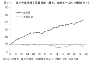 BNPパリバ証券チーフエコノミストの河野龍太郎氏は、日本経済の長期停滞の主因は、大企業が利益を内部にため込み、賃上げや人的資本投資、国内按買に対して消極的なことにあると指摘する。実質賃金の低迷を指摘すると、多くの人は生産性の低さを理由に挙げる。しかし、河野によると、1998年から2023年の間に日本の生産性は30%上昇しているが、実質賃金は横ばいで、この間のインフレにより2%減少している。生産性が上がっても賃金が引き上げられていない。賃上げを抑えて労働分配率をどんどん下げてきたのである。しかも定期昇給の枠外にある非正規労働者をどんどん増やしてきたのである。かつては包摂的だった日本の社会制度は収奪的社会に向かっている。労働者から絞りとっで、配当と内部留保を増やしている。結果、大企業の利益剰余金は600兆円にも積み上がっている(河野龍太郎『日本経済の死角』)。