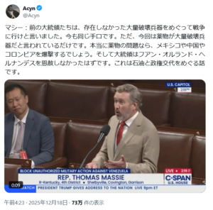 12/17、トランプ政権与党のトーマス・マシー下院議員(ケンタッキー州選出、共和党)は、トランプ大統領が米国議会の承認なしにベネズエラに対していかなる軍事行動も取るべきではないと主張し、「(合衆国憲法の)起草者たちは、戦争遂行権限が一人の人間に集中するほど、自由は消滅するという単純な真理を理解していた」と述べ、 イラクやリビアといった政権転覆戦争におけるアメリカの過去の失敗を例に挙げ、南米で同様の事態を起こすべきではないと警告し、「歴代大統領は、存在しない大量破壊兵器のために戦争をしろと命じてきた」と大量破壊兵器について述べ、「今は同じやり方だ。ただ、麻薬が大量破壊兵器だと教えられているだけだ。もし麻薬が問題なら、メキシコや中国、コロンビアを爆撃するだろう」、もしトランプ大統領が本当に米国への違法薬物の流入を懸念しているのであれば、2024年に400トンのコカインを米国に密輸した罪で有罪判決を受けたホンジュラスの元大統領、フアン・オルランド・エルナンデス氏を恩赦しなかったはずであると、トランプ氏の最も痛いところを明確にし、「これは石油と政権転覆の問題だ」とマッシー氏はトランプ氏を痛烈に批判している。