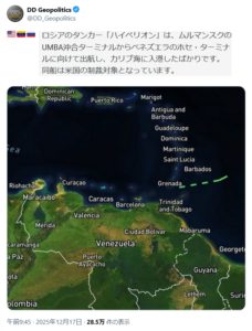 12/17現在、ベネズエラ産原油の輸送経歴がある石油タンカーは、少なくとも34隻が現在カリブ海を航行している。国際貿易情報会社Kplerの船舶位置情報データによると、これらのタンカーのうち少なくとも12隻はベネズエラ産原油を積載している、とされる。ロシアのタンカー「ハイペリオン」は12/17、カリブ海に入ったところである。
