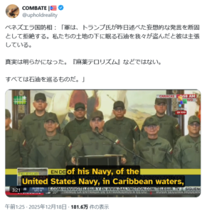 12/17、ベネズエラのマドゥロ大統領は、首都カラカスでの演説で、「これは単なる好戦的で植民地主義的な見せかけに過ぎない。我々は何度もそう言ってきたが、今や誰もが真実を目の当たりにしている。真実は明らかにされたのだ」、「トランプ政権の目的はベネズエラの政権交代であり、傀儡政権を樹立し、憲法、主権、そしてすべての富を手放し、ベネズエラを植民地化することにある。そんなことは決して起こらない」と強調。