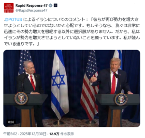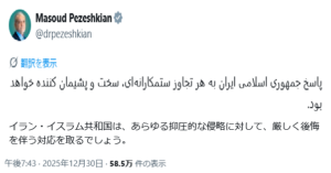 同じく12/30、このような危険な事態の進展に対して、イランのマスード・ペゼシュキアン大統領は、イランが米国、イスラエル、そして欧州と「全面戦争」に突入していると宣言し、新たな攻撃に対してより断固たる対応を取ることを明確に表明している。同時に、イランは、一貫して核兵器開発の追求を否定し、核開発計画は平和目的であることを明確にしている。