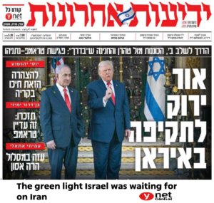 12/30、イスラエルの大手ヘブライ語新聞・Yedioth Ahronoth イェディオト・アハロノトは、一面トップ記事で「トランプ大統領、イラン攻撃を承認」と大きく報じている。その英字ニュース・ynetnews は、「イラン攻撃に青信号」と報じ、イスラエルが待ち望んでいたイランへの青信号であり、これは、「トランプ大統領はイランのミサイル増強に対するイスラエルの行動を支持し、核問題への米国の介入を誓った。これは、イスラエルが先制攻撃を仕掛けるのか、それともイランが次のラウンドを形作る最初の一撃を放つのかという疑問を提起する。」と述べた後、その詳細を以下のように報じている。(ynetnews 2025/12/30)