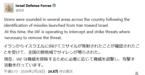 道ミサイルを発射、イスラム革命防衛隊(IRGC)傘下のイランの半国営ファルス通信によると、イスラム革命防衛隊(IRGC)は、そのミサイルと無人機がバーレーンの米海軍第5艦隊司令部、カタールとアラブ首長国連邦の他の米軍基地、さらには「占領地域の中心にある軍事・治安センター」を標的にしたと発表している。革命防衛隊は、「イラン・イスラム共和国に対する敵対犯罪者の侵略に応じて、占領地に対するイラン・イスラム共和国による広範なミサイルと無人機攻撃の第一波が始まった」と述べている。