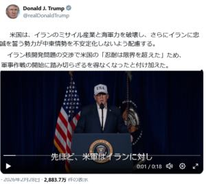 同日さらに、トランプ大統領は、自身のソーシャルメディアで、イラン核開発問題の交渉で、米国の「忍耐は限界を超えた」ため、軍事作戦の開始に踏み切らざるを得なくなった、と表明した。そのビデオ演説で、米国は、イランのミサイル産業と海軍力を破壊し、さらにイランに忠誠を誓う勢力が中東情勢を不安定化しないよう配慮する、対イラン作戦の標的は核・ミサイル計画であると明言したのであった。