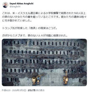 イランのアッバス・アラグチ外相は、Xに墓の写真を投稿し、「これは、米イスラエルによる小学校爆撃で殺害された160人以上の罪のない少女たちの墓を掘っているところです。彼女たちの遺体は引き裂かれていました。トランプ氏が約束した『救出』の現実はこうです。ガザからミナブまで、罪のない人々が冷酷に殺害されているのです。」と述べている。