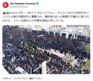 3/3、イラン・ホルモズガーン州ミナブにあるシャジャレ・タイエベ女子小学校が、2月28日の朝、米イスラエル合同による一方的な軍事作戦の初日に攻撃を受け、主に7歳から12歳までの子供たち、少なくとも171人の女子生徒が殺害され、その葬儀が執り行われた。攻撃時に学校にいた少なくとも14人の教職員と保護者4人も死亡している。葬儀の様子を捉えた写真には、小さく浅い墓が何列にも並んでいる様子が写っている。犠牲者の大半は身元が確認されたが、25人は依然として身元不明のままであり、複数の子どもを失った家族もいる。