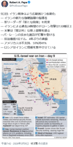 この3/10の記者会見は、2月28日に攻撃を開始して以来初の公式記者会見で、トランプ氏は、記者団に対し、イランはもはや海軍、空軍、対空兵器を保有していない、「全てが吹き飛ばされた」、「彼らにはレーダーも通信手段もなく、指導力も存在しない」、だから対イラン戦は「すぐに終わるだろう」と発言したのであるが、共和党議員に向けた演説では、「我々は既に多くの点で勝利を収めてきたが、まだ十分ではない」と付け加えた。