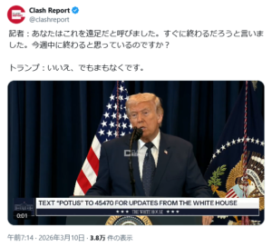 3/10、トランプ大統領は、イランへの攻撃は「間もなく」終了する、ただし、今週中に終結することはないと発言。しかし、そのわずか数分後、フロリダ州ドラルでの記者会見で、イランが世界の石油供給を妨害しようとすれば攻撃を強化すると警告し、中東情勢が悪化する可能性があると発言。さらに、イランが「完全かつ決定的に敗北」するまで戦争は続くと述べている。