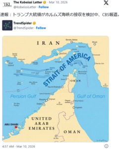 * 3月9日、CBS報道によると、トランプ大統領はホルムズ海峡の制圧を検討している。( Strait of Hormuz → Strait of America )