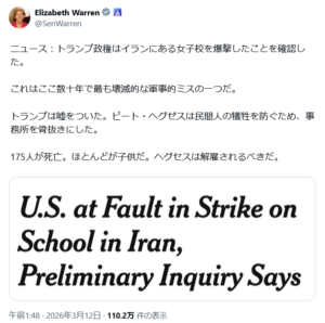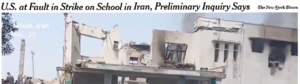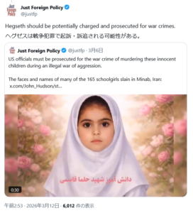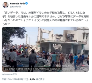 3/11、ニューヨーク・タイムズ紙は、「米軍によるイランの学校攻撃は米国の過失と予備調査が指摘」(U.S. at Fault in Strike on School in Iran, Preliminary Inquiry Says)と題して、「進行中の軍事調査によれば、古い標的データが誤ったミサイル攻撃を引き起こした可能性があり、これはトランプ大統領の「イランに責任がある」との主張を弱めるものだ」と報じている。