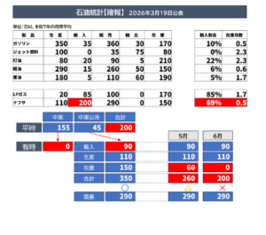 境野春彦氏は「4月から中東がゼロで、中東以外が倍になるとして、輸入90(万kl)+原油精製110+在庫150=350で290の需要を満たせます。ここで60が在庫に回ります。5月も90の輸入が出来たとして、90+110+60=260で需要を満たせない。しかし、稼働率を落としてギリギリ何とか繋ぐとします。6月は在庫が無くなり、90+110=200で需要の2/3しか調達できない。ここで少なからぬ製造業が止まる。」「今のままではこの国はあと2ヶ月しか持ちません」(境野春彦:2026.4.3)と書いている。